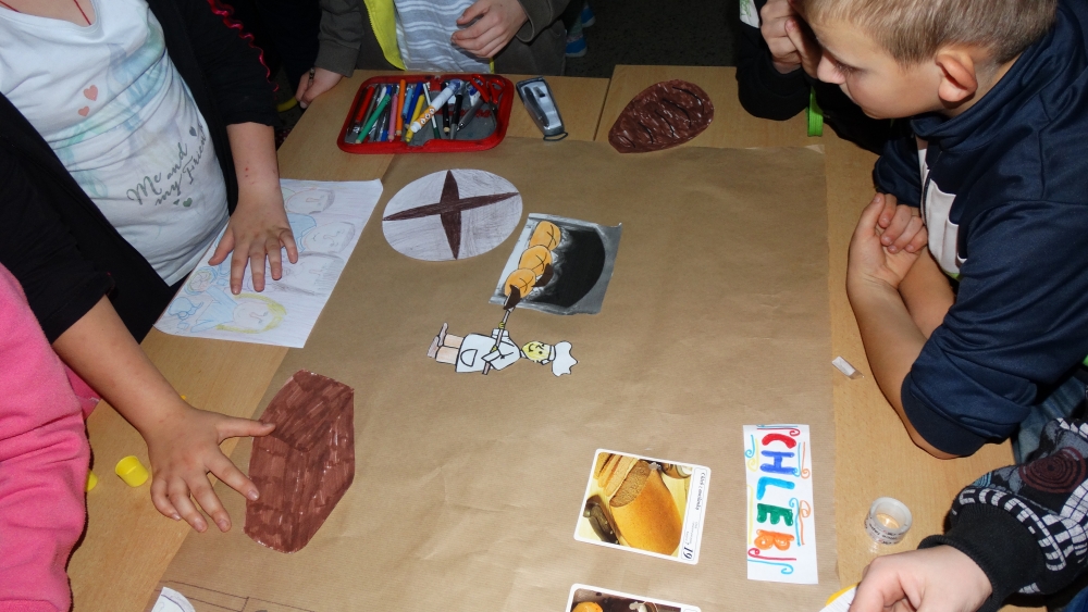 Tato rozdziela bochen cały, aby dzieci po kawałku dostały.