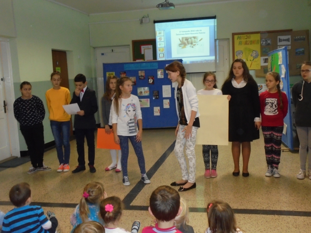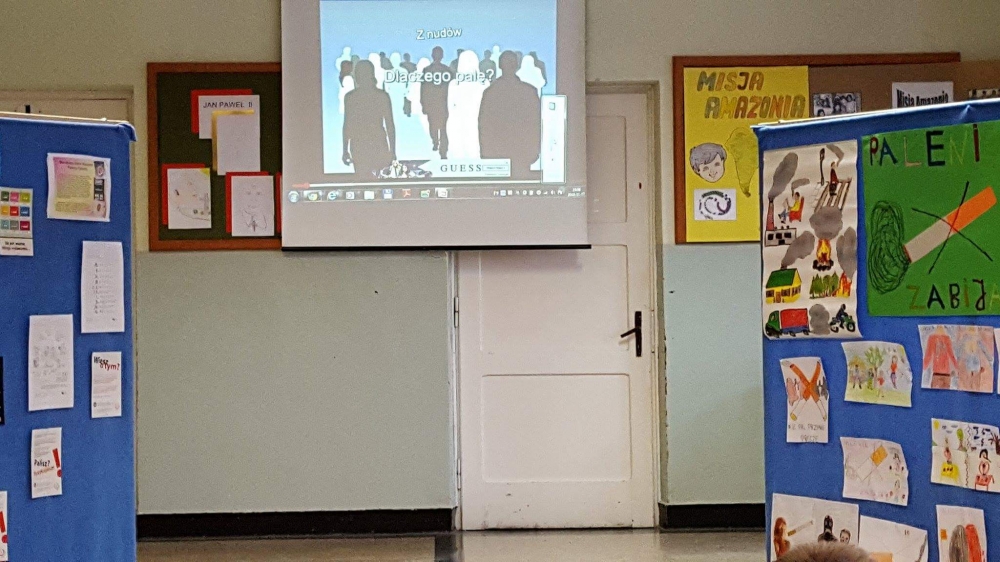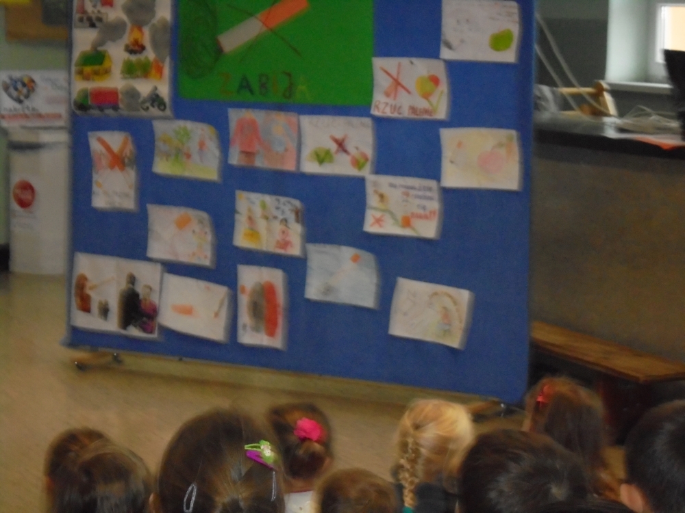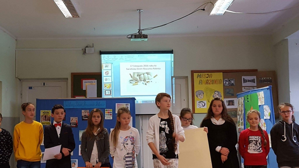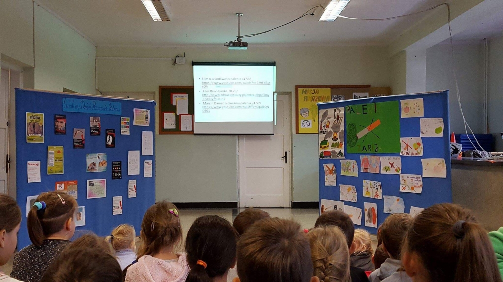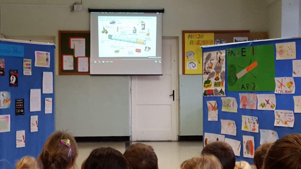 W ramach apelu uczniowie klasy piątej i szóstej przekazali najważniejsze informacje dotyczące skutków palenia tytoniu. Następnie wszyscy mieliśmy okazję obejrzeć film edukacyjny o tym nałogu. Wreszcie wysłuchaliśmy wypowiedzi Marcina Dańca, który przestrzegał młodzież przed sięganiem po papierosy.