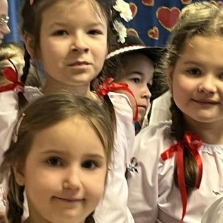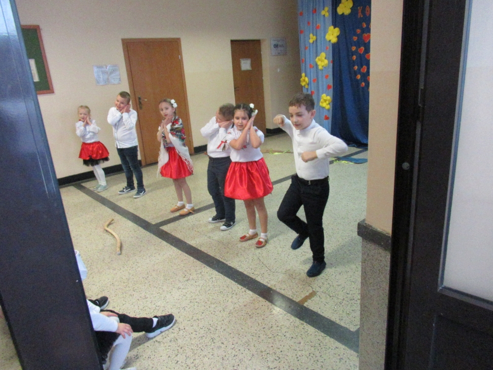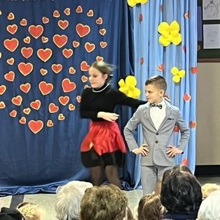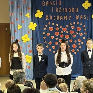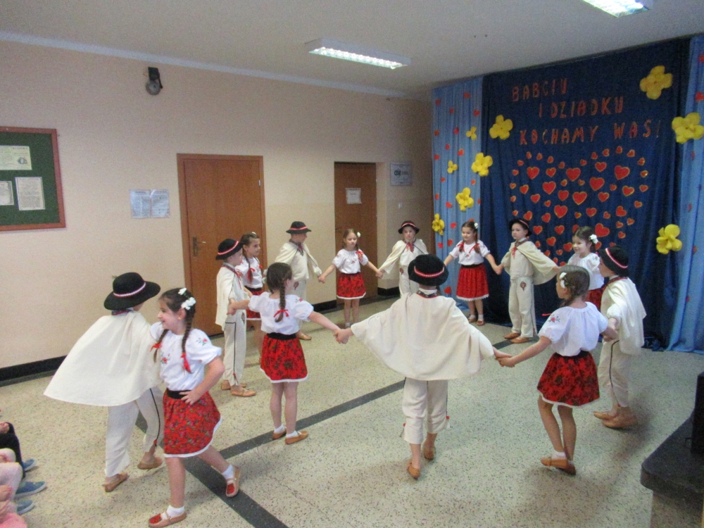 Gdy wypełniły się miejsca przygotowane dla dostojnych Seniorów oraz zaproszonych gości, mogliśmy zacząć nasze szkolne święto. Na początku wszystkich zgromadzonych powitały dzieci z oddziału przedszkolnego. Najmłodsze wnuczęta z przejęciem recytowały wiersze, śpiewały piosenki i pląsały po scenie w rytm skocznych melodii. Następnie szanownym widzom zaprezentowali się w strojach ludowych drugoklasiści z regionalnymi pieśniami oraz żywiołowym tańcem. Potem kolejni uczniowie popisywali się swoimi talentami recytatorskimi, wokalnymi i tanecznymi. Kochani Seniorzy i dostojni goście mogli więc zobaczyć i wysłuchać, między innymi: uczniów klasy III i IV w układzie choreograficznym do muzyki z musicalu Grease, ósmoklasistki tańczące do utworu Born to be happy, uczniów klasy V w przeboju Dawida Kwiatkowskiego Bez ciebie oraz uczennicę klasy IV w utworze Phila Collinsa Against all odds. Zwieńczeniem uroczystości było wręczenie Babciom i Dziadkom kwiatów oraz okolicznościowych laurek. Po czym na scenie wystąpił zespół kolędniczy, który w III Regionalnym Przeglądzie Grup Kolędniczych w Nowym Sączu zdobył nagrodę Grand Prix oraz I miejsce na szczeblu gminnym i II miejsce na powiatowym.
