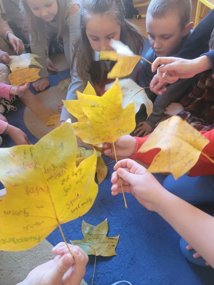 Podczas spaceru do lasu dzieci obserwowały zmieniającą się przyrodę i zbierały kolorowe liście. Zebrane okazy posłużyły później do wyjątkowego zadania – na naturalnych liściach dzieci zapisywały cechy, jakimi charakteryzują się ich rówieśnicy. Były to słowa opisujące pozytywne cechy, takie jak życzliwość, koleżeństwo czy pomocność. Ćwiczenie to miało na celu wzmocnienie pozytywnej samooceny i poczucia własnej wartości u dzieci.<br />